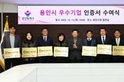 태산뉴스 이지율 기자 | 용인특례시는 11일 시청 접견실에서 ‘2025년 용인시 우수기업 인증제’ 심의 결과 선정된 ‘올해의 우수기업’ 10개 사에 인증서를 전달했다. 이상일 용인특례시장은 이들 기업 대표와 임직원들을 만나 축하와 격려 인사를 나누고 우수기업 인증서와 현판을 전달했다. 이상일 시장은 “우리 경제가 어려운 가운데서도 기업 활동을 잘 해주셔서 우수기업으로 선정된 것을 축하드린다”며 “각자 분야에서 그동안 많은 노하우를 쌓아왔기에 경제가 어려운 가운데서도 성과를 냈고, 우리 지역 경제에도 큰 보탬이 돼 주셔서 감사드린다”고 말했다. 이 시장은 “기업 활동으로 한 가족의 가장은 힘을 얻어 가정을 잘 꾸려갈 수 있고, 신규 일자리를 찾는 사람에게는 희망을 주셨다”며 “기업인들이 활동하실 수 있도록 환경을 잘 개선해 나갈 것”이라고 했다. 시는 매년 경영 실적, 기술·품질 경쟁력, 지역사회 기여도 등 다양한 지표를 종합 평가해 지역경제 발전에 기여한 중소기업을 우수기업으로 인증하고 있다. 올해 선정된 기업은 ▲㈜대성티엠씨 ▲신명이엔씨㈜ ▲주식회사 에이드로 ▲㈜에이치에스씨엠티 ▲주식
