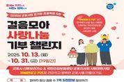 태산뉴스 이지율 기자 | 군포시 산본보건지소는 오는 10월 13일부터 31일까지(19일간) 국민건강보험공단 군포지사와 함께하는 '걸음모아 사랑나눔' 기부챌린지를 운영한다. ‘걸음모아 사랑나눔’ 기부챌린지는 2023년부터 군포시와 국민건강보험공단 군포지사가 협력해 추진해 온 사회공헌형 걷기 사업이다. 시민들이 일상 속에서 걸음을 모아 목표를 달성하면 이를 기부로 연계해 취약계층에 전달하는 방식으로 진행되며 시민과 지역 내 기업·단체가 함께 참여해 건강한 나눔 문화를 지역사회에 확산시키고 있다. 기부챌린지는 군포시민 누구나 참여할 수 있으며 참여 기간은 10월 13일부터 31일까지이다. 참여방법은 워크온 앱을 설치한 뒤 ‘군포시 공식 커뮤니티’에 가입해 챌린지에 참여하면 된다. 챌린지 기간 동안 누적 목표 걸음 수 1억 5천만보를 달성하면 국민건강보험공단 군포지사에서 기부하는 총 100만 원의 기부금이 관내 아동복지시설과 지역아동센터 2곳에 전달될 예정이다. 김미경 군포시 보건소장은 “이번 챌린지는 단순히 건강을 위한 걷기를 넘어 시민 한 분 한 분의 발걸음이 모여 취약계층을 돕는 소중한 나눔으로 이어진다는 데 큰