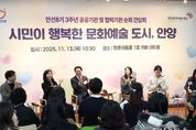 태산뉴스 이동욱 기자 | 안양시는 13일 오전 10시 30분 평촌아트홀 1층 카페 아트림에서 ‘시민이 행복한 문화예술 도시, 안양’을 주제로 (재)안양문화예술재단과 민선 8기 3주년 공공·협력기관 순회 간담회를 개최했다. 이번 간담회는 민선8기 3주년을 맞아 안양시 문화예술 정책의 주요 성과를 공유하고, 현장 예술인과 시민의 의견을 직접 청취하기 위해 마련됐다. 행사에는 안양 지역 예술인과 문화단체 관계자, 시민 등 120여 명이 참석해 안양의 문화예술 비전과 발전 방향에 대해 활발한 소통의 시간을 가졌다. 간담회에서는 ▲시민이 주인공이 되는 ‘안양춤축제’ ▲생활문화로 피어나는 ‘마을축제 지원사업’ ▲지역·청년예술인 창작활동 지원 ▲안양박물관과 공공예술프로젝트(APAP) 등 시민이 함께 만들어가는 다양한 문화예술 사례가 소개됐다. 안양춤축제는 안양만의 축제가 아니라 관광형 축제로 거듭나고 있다. 지난 9월 3일간 열린 축제에는 총 14만2,000여명이 참여했는데, 이 중 40%가 타 시도민으로 추산된다. 춤축제 기간 열린 유스클럽챔피언십의 한 고등학생 참가자는 “대회 분위기가 생각보다 훨씬 뜨거웠고 행복했다”며