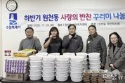태산뉴스 이동욱 기자 | 수원시 영통구 원천동 행정복지센터는 원천동 주민자치회 주관으로 진행하는 '2025년 사랑의 반찬 꾸러미 나눔' 사업을 통해 관내 취약계층 100가구에 반찬 나눔을 실시했다고 25일 밝혔다. 주민자치회는 지역의 어려운 이웃을 돕기 위해 반찬을 직접 조리해 기초생활수급자, 차상위계층, 복지 사각지대 대상자 등 총 100가구에 전달했다. 1차 꾸러미는 2025년 6월 17일, 2차 꾸러미는 11월 25일에 각각 배부를 완료했다. 올해 꾸러미 구성은 주민자치회 위원들이 정성껏 준비한 제육볶음 등으로, 원천동 건강복지팀과의 연계를 통해 대상 가정에 직접 방문하여 전달하며 안부 확인도 함께 진행했다. 원천동은 이번 나눔 활동을 통해 소외된 이웃들의 정서적 고립감을 해소하고, 더 따뜻한 지역 공동체 조성에 기여할 것으로 기대하고 있다. 윤두원 원천동 주민자치회장은 “사랑의 꾸러미 나눔을 통해 관내 취약계층을 지원하고 이웃사랑 실천을 위한 좋은 기회가 됐기를 바란다”고 전했다.