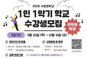 태산뉴스 이동욱 기자 | 수원문화재단은 남녀노소 누구나 악기를 배우고 즐길 수 있는 ‘수원은학교 '1인 1악기 학교'’의 수강생을 10월 10일까지 선착순으로 모집한다. ‘수원은학교 '1인 1악기 학교'’는 문화도시 조성사업의 일환으로, 시민의 문화예술 향유 기회를 확대하여 생활문화를 활성화하기 위해 추진하는 사업이다. 이번 강좌는 △대금(초급, 중급) △소금(초급, 중급) △오카리나 △칼림바 △우쿨렐레 △바이올린 등 총 8개 강좌로 구성됐으며, 공공한옥, 어린이도서관, 공연장 등 수원 전역의 다양한 문화예술 시설에서 운영된다. 수강신청은 온라인으로 가능하며, 수강료는 1개 강좌당 40,000원으로 악기연주와 문화예술에 관심이 있는 시민 누구나 신청할 수 있다. 특히 참여자를 대상으로 악기를 무료로 대여해주어, 악기를 보유하지 않은 시민도 부담 없이 강좌를 수강할 수 있다. 수원문화재단 관계자는 “평소 관심이 있던 악기를 직접 배우고 연주해 보며 일상에 예술적 감성을 더할 수 있는 계기가 되기를 기대한다”며, “악기를 처음 접하는 분들도 쉽게 참여할 수 있도록 초급과정과 악기 대여 서비스를 마련했으