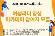 태산뉴스 이동욱 기자 | 안성시는 지역사회 발전을 이끌 열정있고 능력있는 여성 지도자를 발굴·육성하기 위해 ‘2025년 안성시 여성리더 양성 아카데미’ 기본과정 교육 참가자를 모집한다. 이번 아카데미는 적극적으로 참여할 수 있는 여성 시민 누구나 신청할 수 있으며, 신청기간은 오는 10월 15일부터 시작된다. 교육은 11월 5일부터 12월 10일까지 6주간 매주 수요일에 안성시여성비전센터 (발화대길 25) 1층 공유오피스에서 진행 될 계획이다. 교육 내용은 ‘나는 당신이 행복했으면 좋겠습니다.’ 라는 주제로 김경희 강사의 행복소통 리더십 강의로 개강식을 열고 2~3주차는 감성을 담아 나를 알리는 SNS 활용법 이론편과 실습편, 4~5주차에는 나만의 비서 만들기 챗봇과 생성형 AI교육 이론편과 실습편을 구성하여 최신 트렌드에 맞춘 리더 역량 강화를 위한 강의들로 구성했으며 6주차에는 퍼실리테이션 기법을 활용하여 지역 내 현안 문제를 파악하고 리더로서 해결 방법을 제시하는 과정을 마지막으로 수료식을 가질 예정이다.