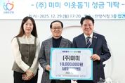 태산뉴스 이동욱 기자 | 안양시는 지난 29일 ㈜미미로부터 이웃돕기 성금 1천만원을 기탁받았다고 30일 밝혔다. 이날 시청 접견실에서 열린 성금 전달식에는 최대호 안양시장과 조인주 ㈜미미 회장, 조예서 전무 등이 참석했다. ㈜미미는 만안구 덕천로에 소재한 기업으로 용역·청소·경비·주택업·건물종합관리 등 다양한 분야에서 사업을 운영하고 있으며, 지역사회 나눔과 사회공헌 활동에도 꾸준히 동참하고 있다. 이번에 기탁된 성금은 안양시 이웃돕기 성금으로 사용되며, 저소득층 건강보험료 지원과 취약계층 물품 지원 등 관내 어려운 이웃을 돕는 데 활용될 예정이다. 조인주 회장은 “지역사회로부터 받은 사랑을 다시 이웃과 나누고자 성금을 기탁하게 됐다”며 “작은 정성이지만 어려운 분들께 도움이 되기를 바란다”고 전했다. 최대호 안양시장은 “연말을 맞아 따뜻한 나눔을 실천해 주셔서 감사드린다”면서 “성금은 저소득층과 취약계층 등 도움이 절실한 이웃들에게 투명하고 공정하게 전달하겠다”고 말했다.