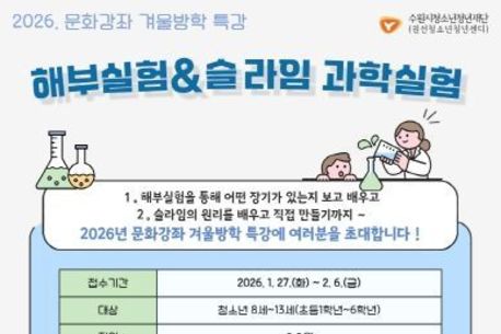 태산뉴스 김준수 기자 | 경기문화재단 경기북부어린이박물관(관장 허윤형)은 2026년 겨울방학을 맞아 〈손에 담은 겨울, 색으로 피우다〉를 주제로 교육체험 프로그램을 1~2월 주말 운영한다. 이번 프로그램은 이례적인 한파를 겪고 있는 요즘, 어린이들이 다양한 자연의 재료를 손끝으로 느끼며 계절의 변화를 감각적으로 즐길 수 있도록 마련됐다. 〈손에 담은 겨울, 색으로 피우다〉의 세부 프로그램으로는 ▲달리는 새해, 컬러링 달력 만들기(새해 달력 컬러링), ▲겨울을 녹이는 손난로 만들기(친환경 손난로 만들기) ▲반려돌 꾸미기(기획전시 ‘아이돌’ 연계 체험)를 운영한다. 1월 24일부터 2월 7일까지 토요일마다 운영되는 ‘달리는 새해, 컬러링 달력 만들기’는 환경과 관련된 기념일을 주제로 새해 달력을 색과 꽃으로 꾸미며 환경감수성을 키우는 프로그램이다. 1월 25일부터 2월 8일까지 일요일마다 운영되는 ‘겨울을 녹이는 손난로 만들기’는 수면양말과 팥을 활용해 친환경 손난로를 만들며 자연의 온기를 나눈다. 매주 토, 일 하루 3회씩 운영되는 ‘반려돌 꾸미기’는 박물관의 기획전시 ‘아이돌’ 연계 체험으로, 인간과 자연