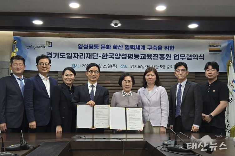 태산뉴스 김준수 기자 | 경기도일자리재단은 25일 수원시에 위치한 남부사업본부에서 한국양성평등교육진흥원과 ‘양성평등 문화 확산과 폭력예방 의식 제고’를 위한 업무협약을 체결했다.