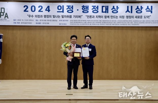 태산뉴스 김준수 기자 | 문병근 경기도의회 건설교통위원회 부위원장(국민의힘·수원11)이 12월 11일 경기도 일간기자단 주최 ‘2024년 의정·행정대상’ 시상식에서 베스트 상임위원 상을 수상했다. 이 상은 경기도 지자체와 지방의회 활동 성과를 평가해 도내 10개 언론사가 선정·수여한다.