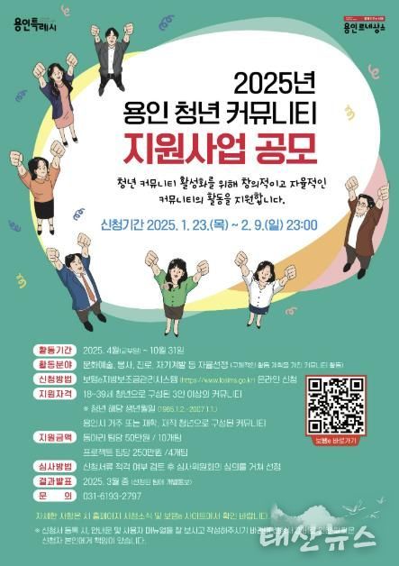 태산뉴스 이동욱 기자 | 용인특례시는 ‘2025년 용인 청년 커뮤니티 지원사업’에 참여할 14개 팀을 모집한다고 24일 밝혔다.