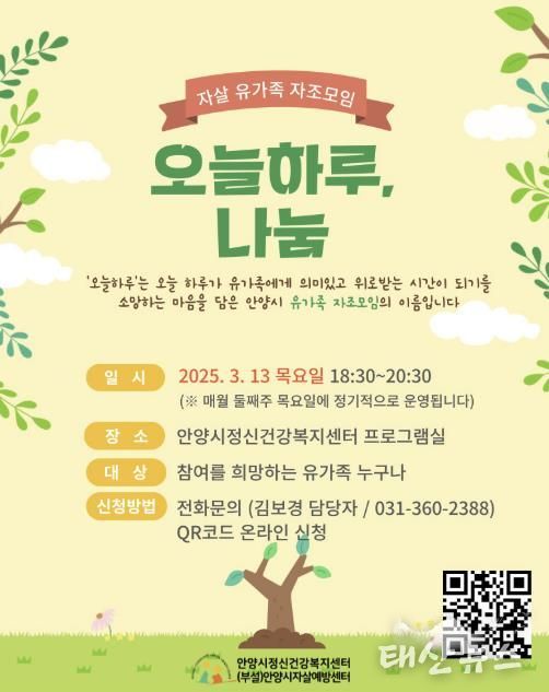 태산뉴스 이동욱 기자 | 안양시정신건강복지센터(부설 자살예방센터)는 오는 13일부터 가족이나 가까운 사람을 잃은 유가족을 대상으로‘오늘 하루, 나눔’프로그램을 운영한다고 7일 밝혔다.