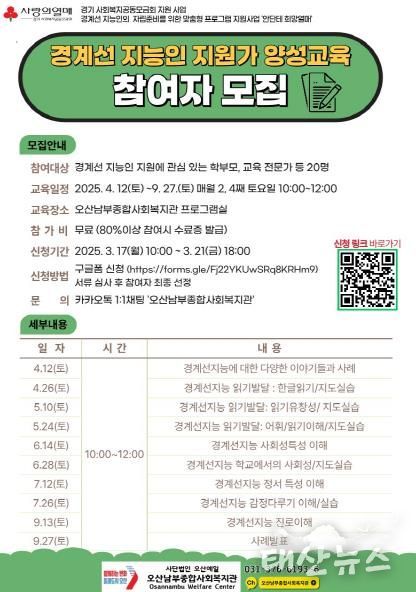 이번 교육은 경계선 지능인 지원에 관심이 있는 학부모, 교사, 교육전문가 20명을 대상으로 2025년 4월 12일부터 9월 27일까지 매월 2, 4째주 토요일, 총 20시간 진행된다.