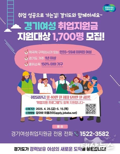 태산뉴스 김준수 기자 | 경기도가 경력보유여성 등 35~59세 사이 여성의 취업을 돕기 위한 ‘경기여성 취업지원금’ 사업 참여자 1,700명을 5월 15일까지 모집한다.