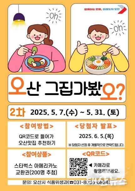 태산뉴스 이동욱 기자 | 오산시는 오산의 숨은 맛집 발굴을 위한‘오산 그집 가봤오?’를 4월에 이어 5월에도 진행한다고 밝혔다.