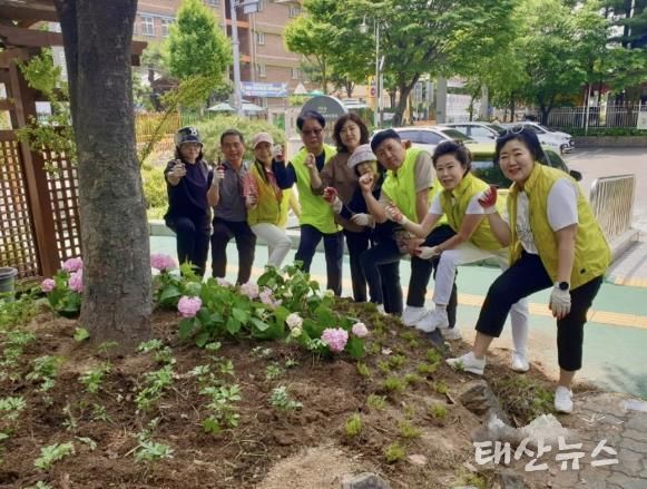 이번 사업은 교문2동주민자치위원 26명이 직접 참여해 행정복지센터 내 유휴 공간 2개소와 아치 주변에 ▲작약 60본 ▲꽃잔디 405본 ▲수국 5본 ▲등나무 2주를 식재하는 방식으로 진행됐으며, 특히 청사 내 주민 휴식 공간인 파고라를 중심으로 아름다운 녹지공간을 조성해 주민들에게 쾌적하고 자연 친화적인 휴게 환경을 제공한다는 계획이다.