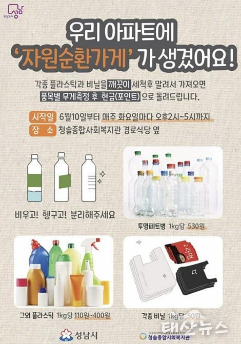 태산뉴스 이동욱 기자 | 성남시는 재활용 가능한 쓰레기를 가져오면 현금처럼 쓸 수 있는 포인트를 적립해 주는 ‘자원순환가게’를 분당구 금곡동 청솔종합사회복지관 옆에 추가 설치해 10일 문을 열었다.