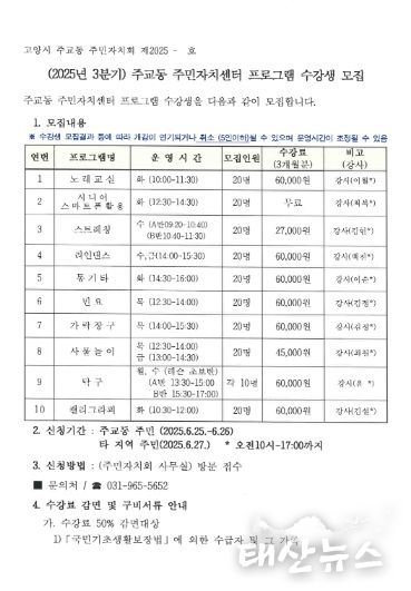 태산뉴스 이동욱 기자 | 고양특례시 덕양구 주교동 주민자치회는 오는 6월 25일에서 27일까지 2025년 3분기 주민자치센터 문화강좌 프로그램 수강생을 모집한다고 밝혔다.