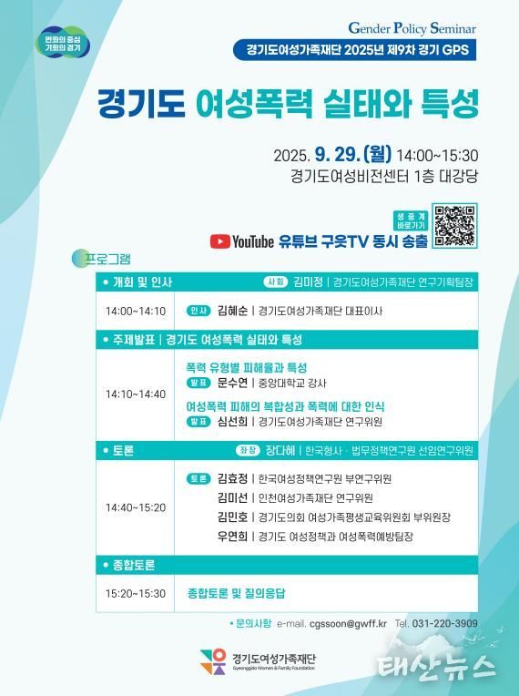 태산뉴스 김준수 기자 | 경기도여성가족재단은 29일 오후 2시 경기도여성비전센터 1층 대강당에서 ‘경기도 여성폭력 피해 실태와 특성’을 주제로 정책토론회를 개최한다.