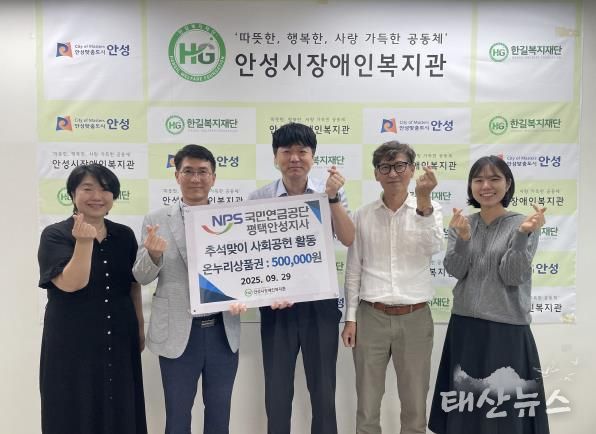 태산뉴스 이동욱 기자 | 사회복지법인 한길복지재단에서 수탁하고 있는 안성시장애인복지관은 지난 9월 29일 국민연금공단 평택안성지사로부터 사회공헌활동으로 50만원 상당의 온누리 상품권을 후원받았다고 밝혔다.