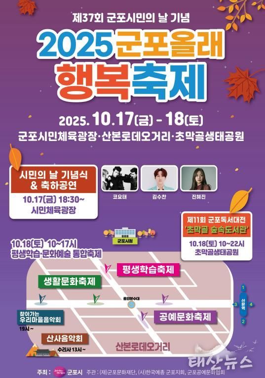 태산뉴스 이지율 기자 | 군포시는 제37회 시민의 날을 기념하여 오는 10월 17일부터 10월 18일 양일간 군포올래 행복축제를 개최한다.