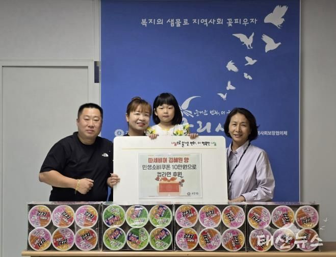 태산뉴스 이동욱 기자 | 구리시 교문1동 행정복지센터는 지난 10월 1일, 관내 식당 따세비어의 딸 김혜원(5세) 양이 민생 소비 쿠폰 10만 원으로 마련한 컵라면 17박스를 어려운 취약계층에 전달하기 위해 기탁했다고 밝혔다.