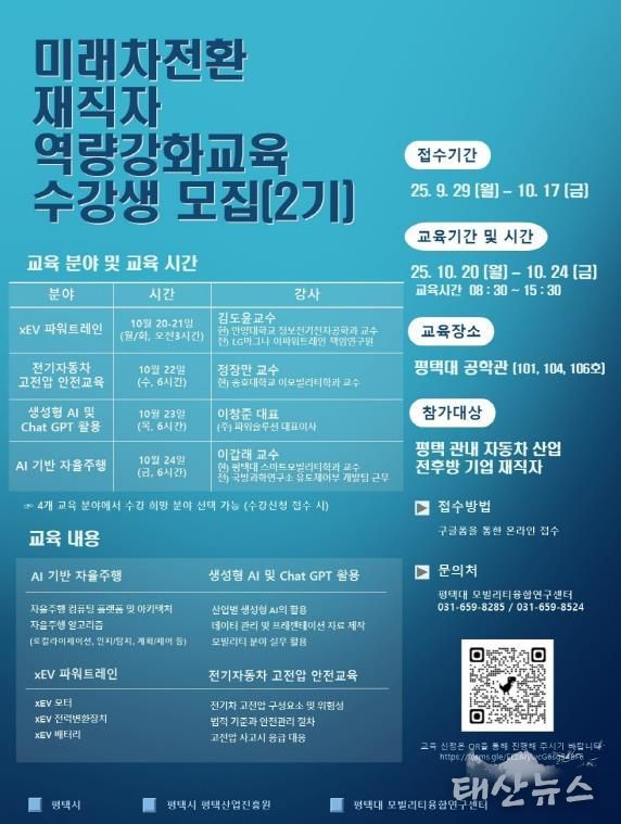 태산뉴스 이동욱 기자 | 평택시와 평택산업진흥원이 ‘미래차 전환 재직자 역량 강화교육’ 2기 과정을 개설한다. 교육은 10월 20일부터 24일까지 교육 운영기관인 평택대학교에서 진행되며, 지역 자동차 산업 재직자를 대상으로 미래차 핵심 분야 전문지식을 제공한다.