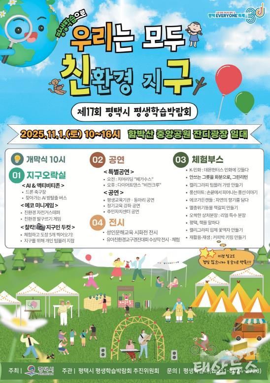 태산뉴스 이지율 기자 | 평택시는 오는 11월 1일 함박산 중앙공원에서 ‘2025년 제17회 평택시 평생학습박람회’를 개최한다.