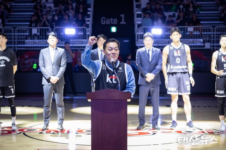 태산뉴스 이동욱 기자 | 이재준 수원특례시장이 4일 수원KT소닉붐아레나에서 열린 ‘2025-2026 프로농구 KBL 홈 개막전’에서 개막선언을 했다.