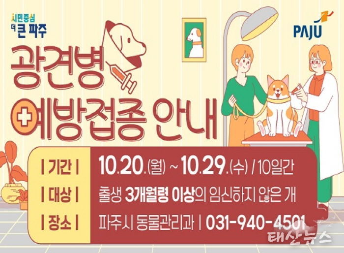 태산뉴스 이동욱 기자 | 파주시는 반려견을 동반한 야외활동이 잦아지는 가을을 맞아 오는 20일부터 29일까지 생후 3개월 이상의 임신하지 않은 개를 대상으로 광견병 예방접종을 실시한다고 밝혔다.