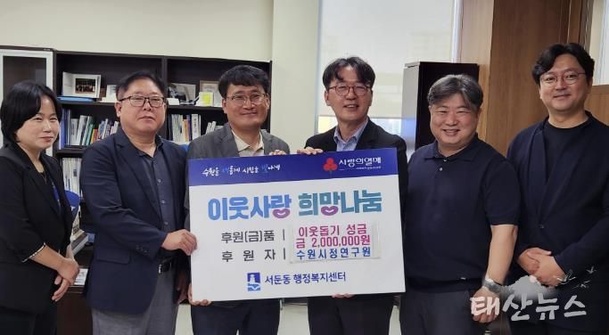 태산뉴스 이동욱 기자 | 수원시정연구원과 수원시정연구원 사우회가 지난 10월 2일, 추석을 맞아 나눔을 실천하고자 성금 200만원을 서둔동 행정복지센터에 기탁했다. 이번 기탁금은 수원시정연구원장과 수원시정연구원 사우회에서 각 100만원을 모아 마련한 것이다.
