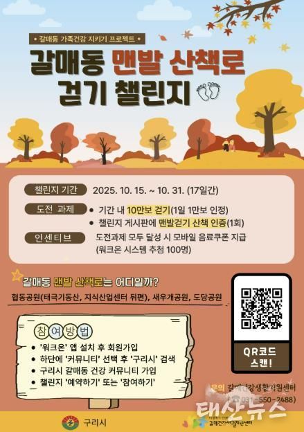 태산뉴스 이동욱 기자 | 구리시는 가을철 주민들의 건강한 생활 습관 형성과 스트레스 완화를 위해 ‘갈매동 맨발 산책로 걷기 챌린지’를 오는 10월 15일부터 31일까지 17일간 운영한다고 밝혔다.
