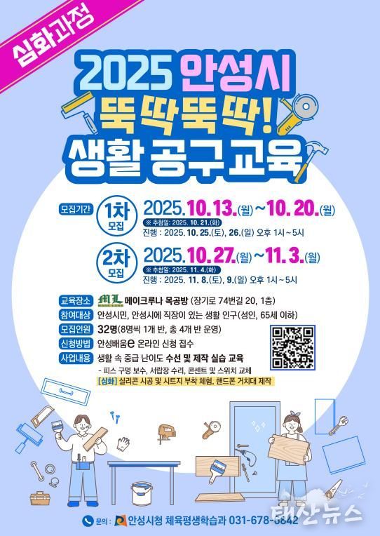 태산뉴스 이동욱 기자 | 안성시는 시민들의 생활 자립 역량 강화를 위해 '뚝딱뚝딱 생활 공구[심화과정] 교육'을 오는 10월 25~26일과 11월 8~9일, 총 2회 주말 일정으로 운영한다고 밝혔다.