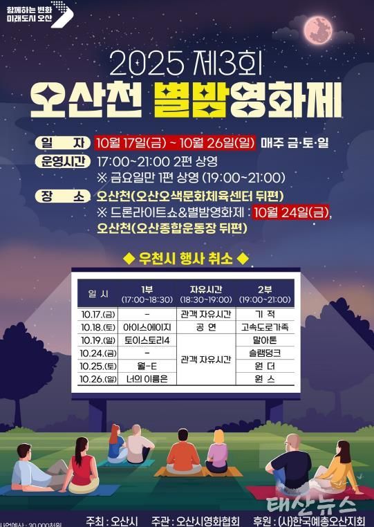 태산뉴스 김준수 기자 | 오산시는 오는 10월 17일부터 26일까지 매주 금·토·일 저녁, 오산천(오색문화체육센터 뒤편)에서 시민들이 야외에서 영화를 즐길 수 있는 '2025 제3회 오산천 별밤영화제'를 개최한다고 밝혔다.