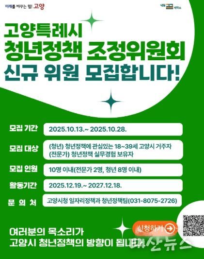 태산뉴스 이동욱 기자 | 고양특례시는 청년이 시정의 주체로 참여해 정책을 함께 만들어갈 수 있도록 고양시 청년정책조정위원회 청년 및 전문가 위원을 공개 모집한다고 밝혔다.