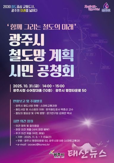 태산뉴스 이동욱 기자 | 광주시는 오는 31일 오후 2시, 광주시청 수어장대홀(10층)에서 ‘함께 그리는 철도의 미래’를 주제로 광주시 철도망 계획 시민 공청회를 개최한다.