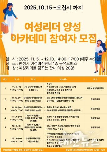 태산뉴스 이동욱 기자 | 안성시는 지역사회 발전을 이끌 열정있고 능력있는 여성 지도자를 발굴·육성하기 위해 ‘2025년 안성시 여성리더 양성 아카데미’ 기본과정 교육 참가자를 모집한다.