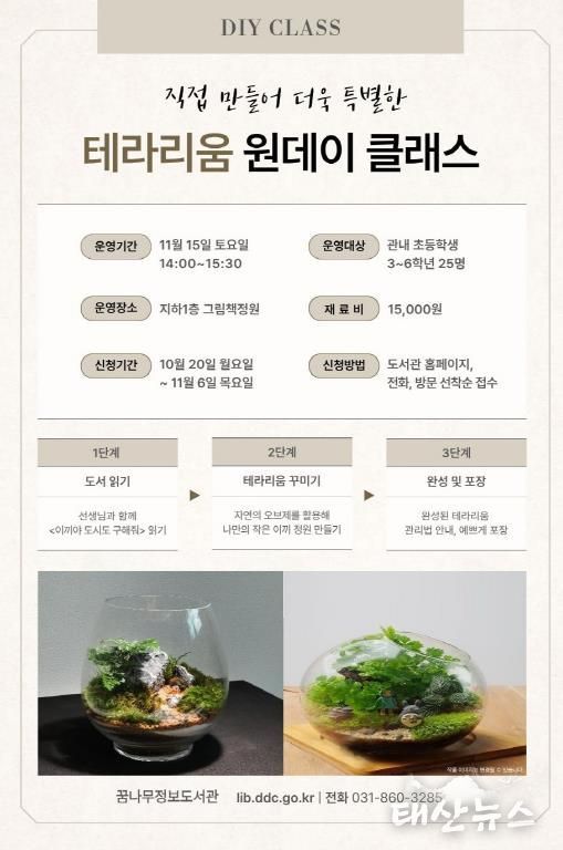 태산뉴스 이동욱 기자 | 동두천시 도서문화사업소 꿈나무정보도서관은 오는 10월 20일부터 초등학교 3~6학년을 대상으로 『테라리움 만들기』 원데이 클래스를 운영한다고 밝혔다.