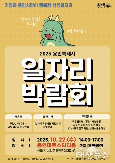 태산뉴스 이지율 기자 | 용인특례시는 오는 22일 오후 2시부터 5시까지 용인미르스타디움 2층 덱(deck) 광장에서 2025년 하반기 일자리박람회를 개최한다고 17일 밝혔다.