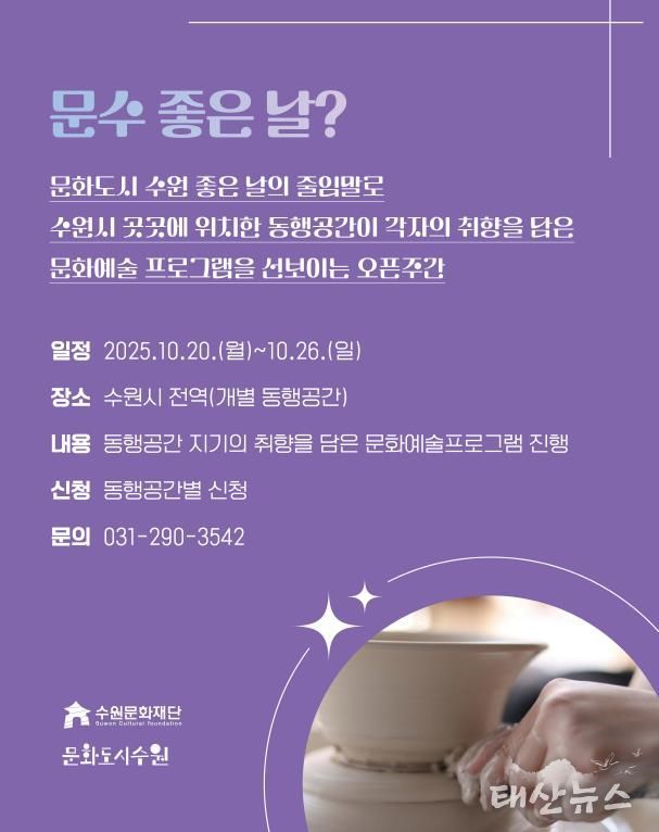 태산뉴스 이동욱 기자 | 수원문화재단이 오는 20일부터 26일까지 ‘동행공간’ 특별 주간인 ‘문수 좋은 날’을 운영한다.