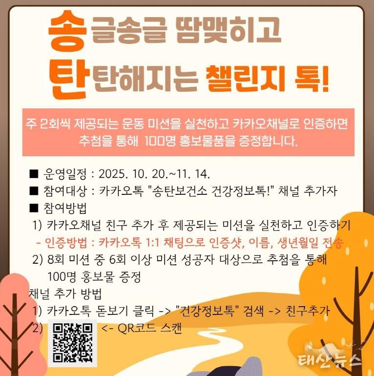 태산뉴스 이지율 기자 | 평택시 송탄보건소는 10월 20일부터 11월 14일까지 카카오톡을 활용한 ‘(송)글송글 땀 맺히고 (탄)탄해지는 챌린지 톡!’을 운영할 예정이라고 밝혔다.