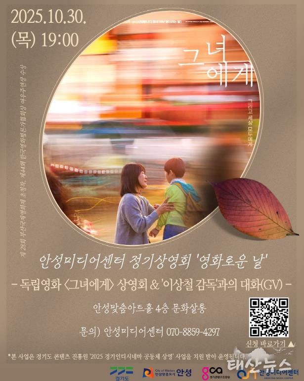 태산뉴스 이동욱 기자 | 안성미디어센터는 오는 10월 30일 오후 7시, 안성맞춤아트홀 4층 문화살롱에서 2025년 4분기 정기상영회 영화로운 날을 개최한다. 이번 상영회에서는 독립영화 '그녀에게'가 무료 상영되며, 상영 후에는 이상철 감독(영화 ‘그녀에게’)과 소희정 소장(나비심리상담연구소)이 함께하는 GV(관객과의 대화)가 마련된다.