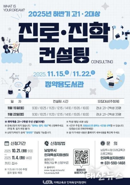 태산뉴스 이동욱 기자 | 남양주시는 오는 21일부터 ‘2025년 하반기 진로·진학 컨설팅’참가자를 모집한다고 밝혔다.