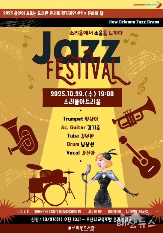 태산뉴스 김준수 기자 | 경기도 오산시는 오는 10월 29일 오후 7시, 소리울도서관 3층 소리울아트리움에서 '2025 음악이 흐르는 도서관 콘서트 정기공연 #6 × 문화의 달 – Jazz Festival; 소리울에서 소울을 느끼다'를 개최한다고 밝혔다.