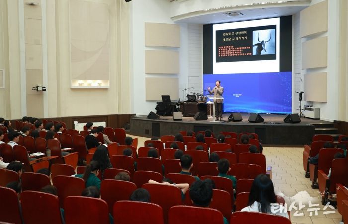 태산뉴스 이동욱 기자 | 이상일 용인특례시장이 17일 오후 기흥구 신갈동에 있는 새물결기독학교에서 학생들을 대상으로 ‘관찰하고 상상하며 새로운 길을 개척하라’는 주제로 약 한 시간에 걸쳐 특강을 했다.