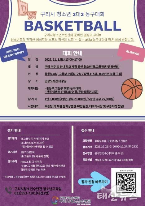 태산뉴스 이동욱 기자 | 구리시청소년재단 청소년수련관은 '2025 구리시 청소년 3대3 농구대회' 참가 신청을 10월 22일부터 10월 27일까지 온라인으로 신청받는다고 밝혔다.
