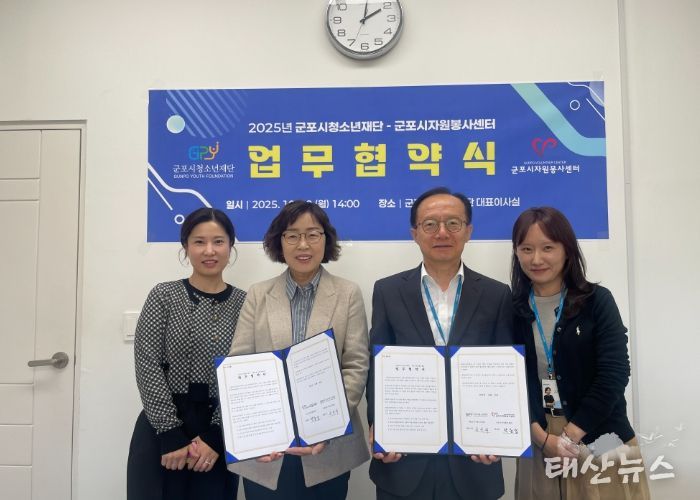 태산뉴스 이동욱 기자 | 군포시청소년재단은 10월 20일 군포시청소년재단 대표이사실에서 군포시자원봉사센터와 지역사회 상생 및 자원봉사 활성화를 위한 업무협약을 체결했다.
