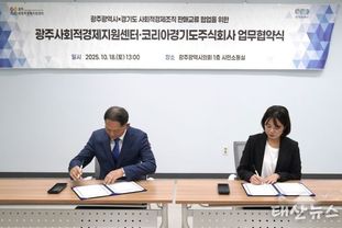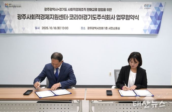 태산뉴스 김준수 기자 | 경기도주식회사와 광주광역시 사회적경제지원센터가 지난 18일 광주광역시 시의회에서 ‘경기도-광주광역시 사회적경제조직 판매교류 협업을 위한 업무협약’을 체결하고 사회적경제조직 활성화를 위해 공동 노력하기로 했다.