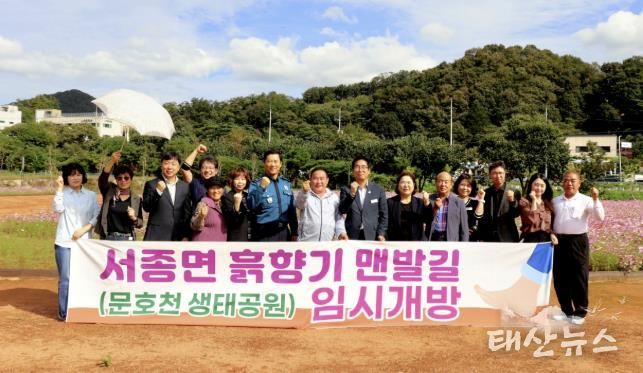 태산뉴스 이동욱 기자 | 양평군 서종면은 지난 17일 오후 1시, 서종면 문호리 968 일대 문호천 생태공원에서 ‘서종면 흙향기 맨발길’ 임시 운영을 기념하는 걷기 행사를 개최했다.