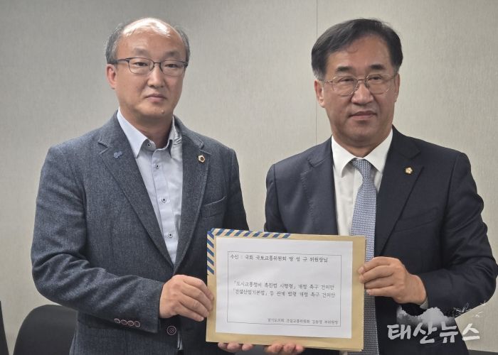 태산뉴스 김준수 기자 | 경기도의회 건설교통위원회 김동영 부위원장(더불어민주당, 남양주 오남)은 20일 경기도청 율곡홀에서 열린 2025년 국회 국토교통위원회 국정감사 현장을 찾아, 국회 국토교통위원회 맹성규 위원장에게 '도시교통정비 촉진법 시행령' 개정 촉구 건의안과 '건설산업기본법' 개정 촉구 건의안 등 경기도의회가 의결한 두 건의 건의안을 전달했다.