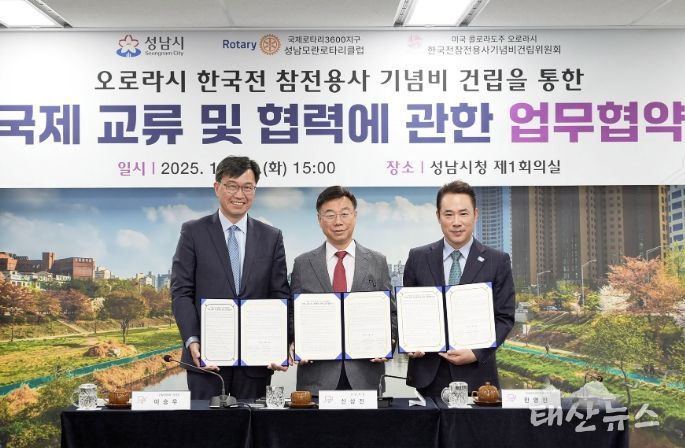 시는 10월 21일 오후 3시 시청 4층 제1회의실에서 신상진 성남시장과 한영현 국제로타리3600지구 성남모란로타리클럽 회장, 이승우 미국 오로라시 한국전참전용사기념비건립위원회 이사장 등 9명이 참석한 가운데 ‘오로라시 한국전 참전용사 기념비 건립을 통한 국제 교류 및 협력 업무에 관한 협약’을 체결했다.