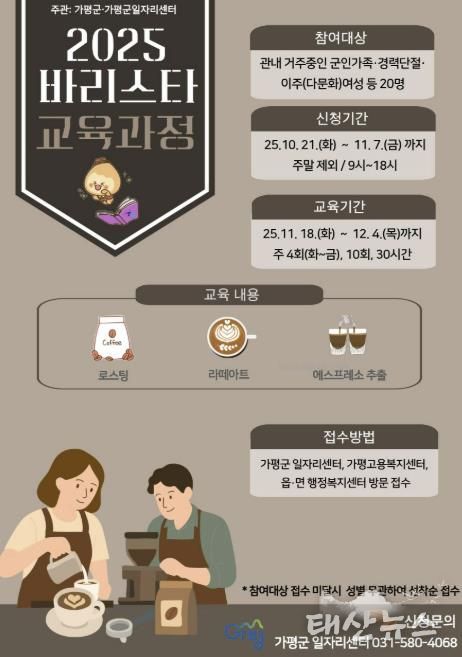 태산뉴스 이동욱 기자 | 가평군은 군인가족, 경력단절여성, 다문화여성 등 취업취약계층 여성을 대상으로 ‘바리스타 2급 자격증 취득과정’을 운영하며, 총 20명의 교육생을 모집한다.