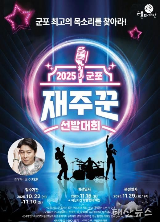 태산뉴스 이동욱 기자 | 지난해 큰 호응을 얻었던 '군포 재주꾼 선발대회'가 올해도 돌아온다. 군포문화재단은 군포시민들이 자신의 끼와 재능을 공연과 결합해 무대 위에서 마음껏 발휘할 수 있도록 기획한 시민참여형 문화 프로그램 '2025 군포 재주꾼 선발대회'를 오는 11월 29일 군포문화예술회관 수리홀에서 개최한다.