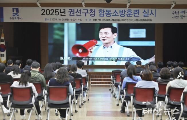 태산뉴스 이동욱 기자 | 수원시 권선구는 지난 28일 수원남부소방서(서둔119안전센터)와 권선구 직원들과 함께 공공기관 합동소방훈련을 실시했다.